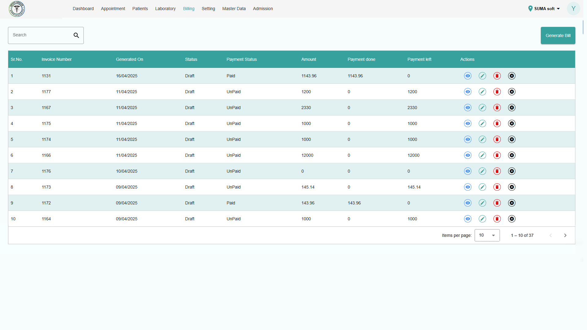 Each bill entry includes detailed fields for “Amount,” “Payment Done,” and “Payment Left,” promoting full transparency and accountability. This allows hospitals to reconcile payments easily, flag unpaid bills, and follow up as needed—all in one place. The system clearly marks draft statuses and unpaid bills, keeping billing gaps from falling through the cracks.